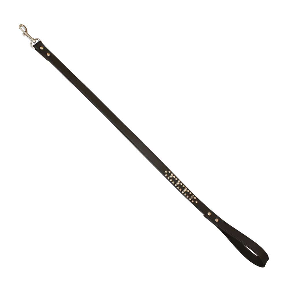 Correa de piel negra recubierta de símil piel. Las tachuelas redondeadas y afiladas que componen la decoración hacen que la línea sea original y actual.